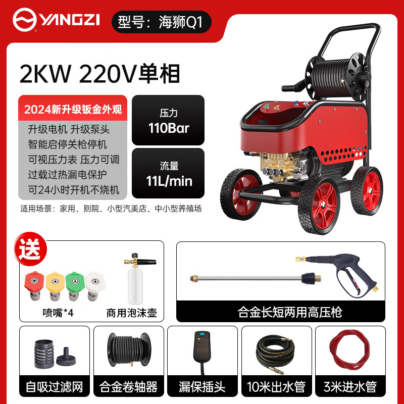 揚子海獅洗車機商用洗車高壓洗車機洗車店養(yǎng)殖場220V大功率高壓清洗機,商用曲軸泵,專用精鍛泵頭,不銹鋼噴瓷柱塞,9股鋼絲編織高壓管,可承受200KG壓力。